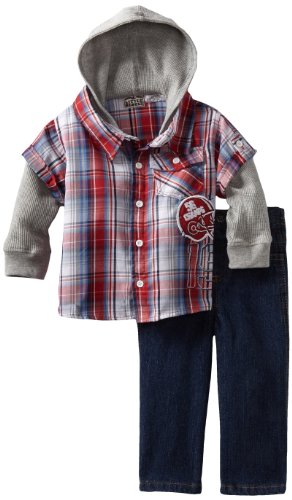 Red and blue plaid button down shirt with football 56 champs screenprint and grey thermal hood and sleeves, denim pant to match ...Read
