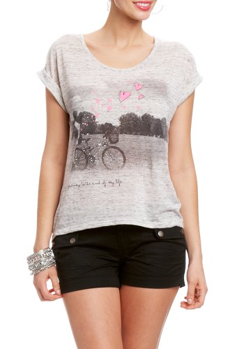 Round out your casual chic wardrobe by adding in a spring essential- printed tees! This one features basic short sleeves with on-trend high low cut and the cutest-of-cute bicycle heart print that wheal be pairing with destroyed denim for our next ride around town. ...Read